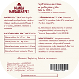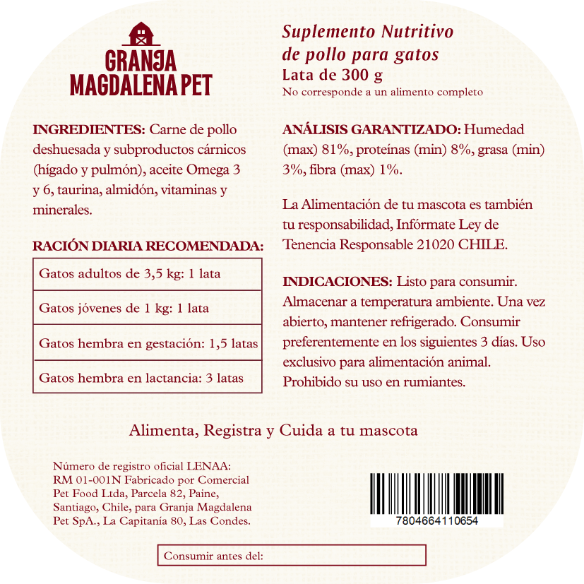 La Terrine de Pollo es un alimento húmedo natural, ideal como snack o complemento diario para gatos de todas las edades. Elaborada con carne de pollo deshuesada, hígado y pulmón, y enriquecida con taurina, Omega 3 y 6, vitaminas y minerales que apoyan la salud del corazón, la visión y un pelaje brillante.