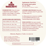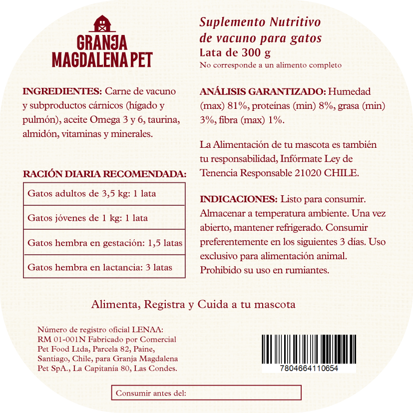 Carne de vacuno, subproductos cárnicos (hígado y pulmón), aceite Omega 3 y 6, almidón, taurina, vitaminas y minerales.